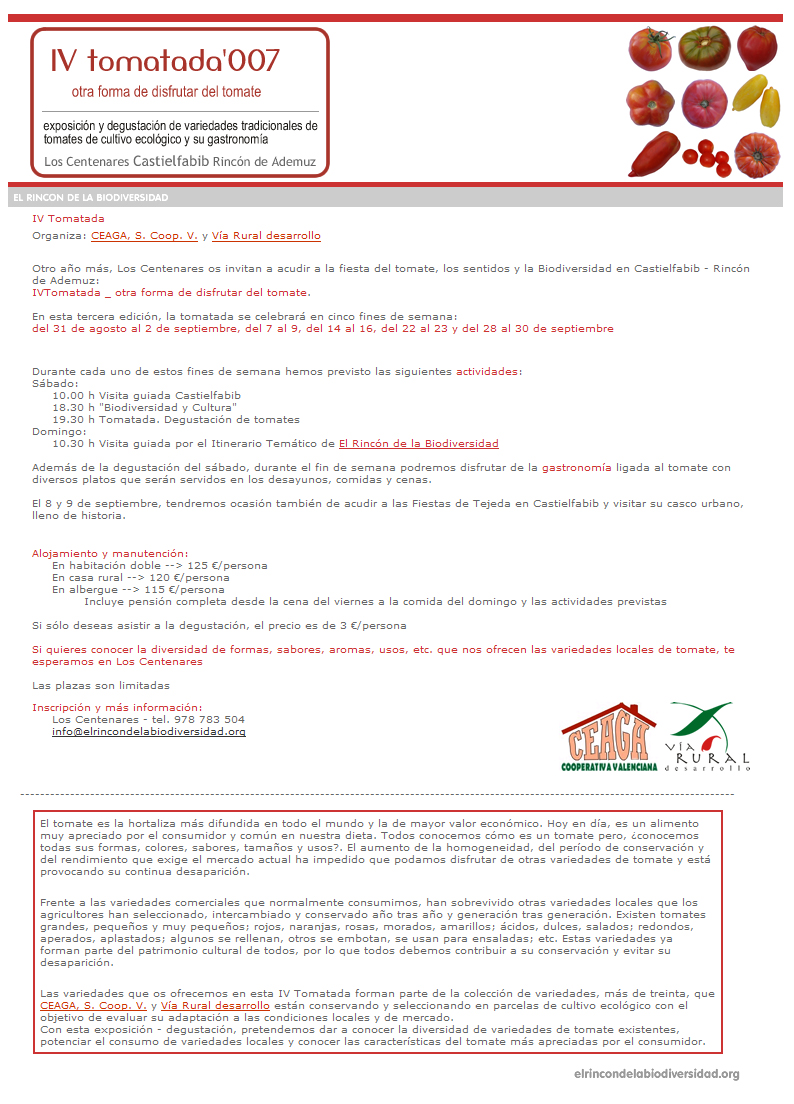 Otro año más, Los Centenares nos invitan a acudir a la fiesta del tomate, los sentidos y la Biodiversidad en Castielfabib (Rincón de Ademuz). Se trata de la «IV Tomatada: otra forma de disfrutar del tomate»
