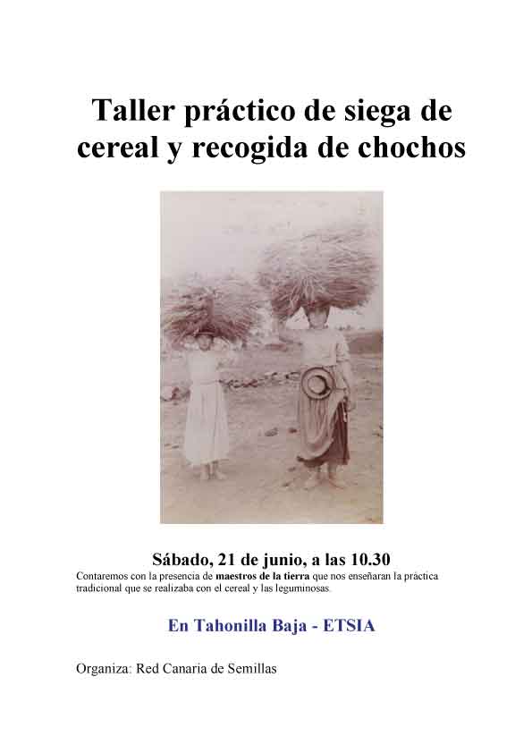 El próximo sábado la Red Canaria de Semillas realiza un taller práctico de siega de cereal y recogida de chochos. Contaremos con la presencia de maestros de la tierra que nos enseñaran la práctica tradicional que se realizaba con el cereal y las leguminosas. Además como buena labor tradicional pararemos con el calor del mediodía para tomar un vino y comer lo que hayamos traído. No todo va a ser trabajar.